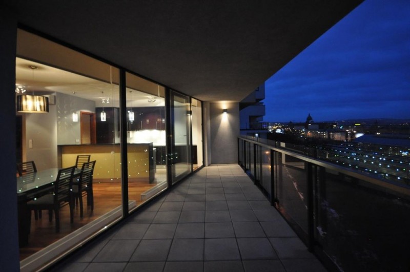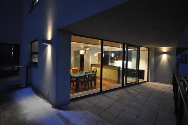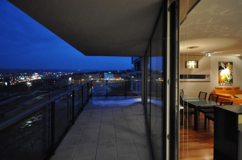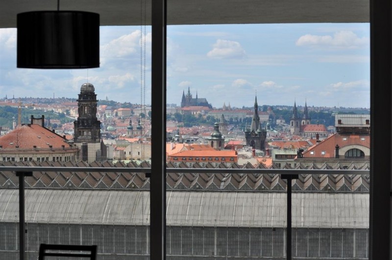 Byt je situován ve druhém patře domu a disponuje otevřeným obývacím prostorem/ jídelní částí, kde jsou okna sahající od podlahy ke stropu dále disponuje moderní plně vybavenou kuchyní s vestavěnými spotřebiči. Je zde velká rohová slunná terasa s fantastickým výhledem na město a Pražský hrad, je přístupná z obývací části.