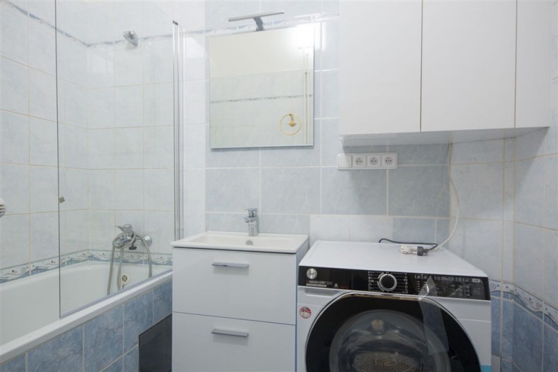- V koupelně se nachází vana se sprchovacím koutem a kombinovaná pračka se sušičkou