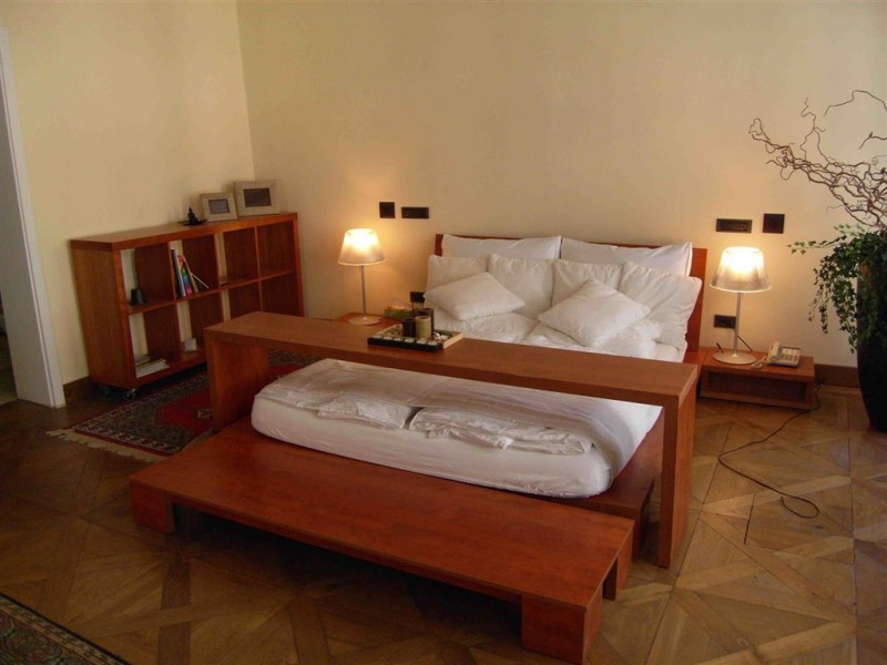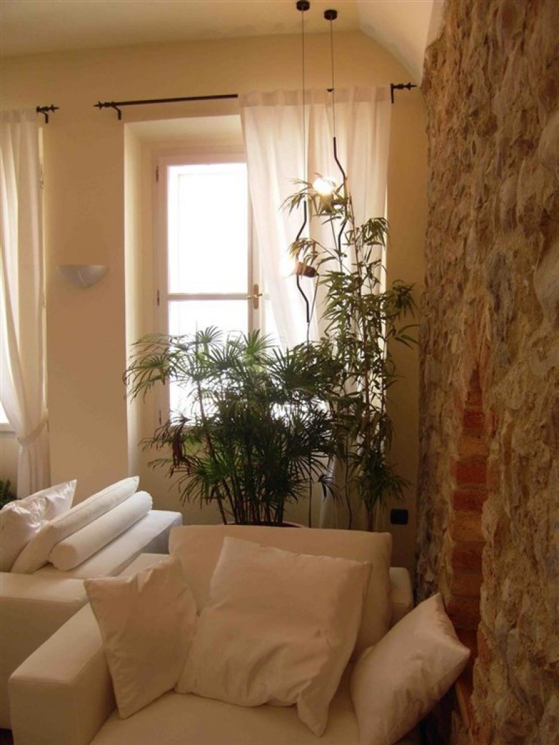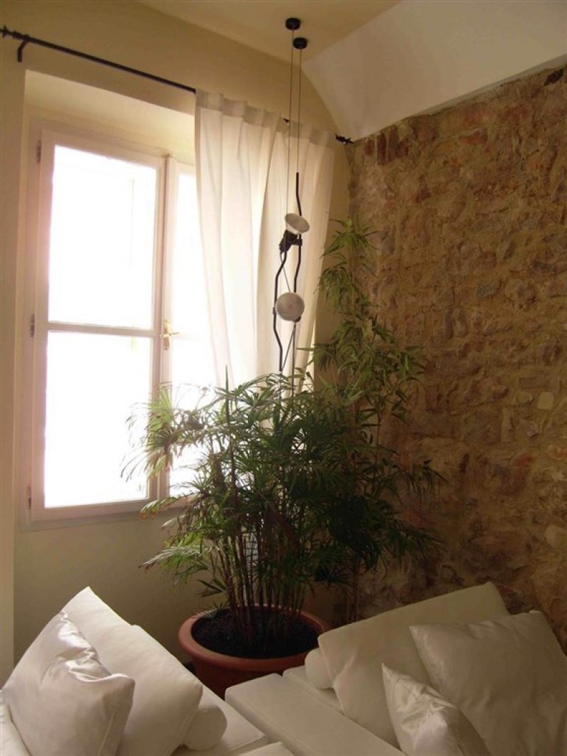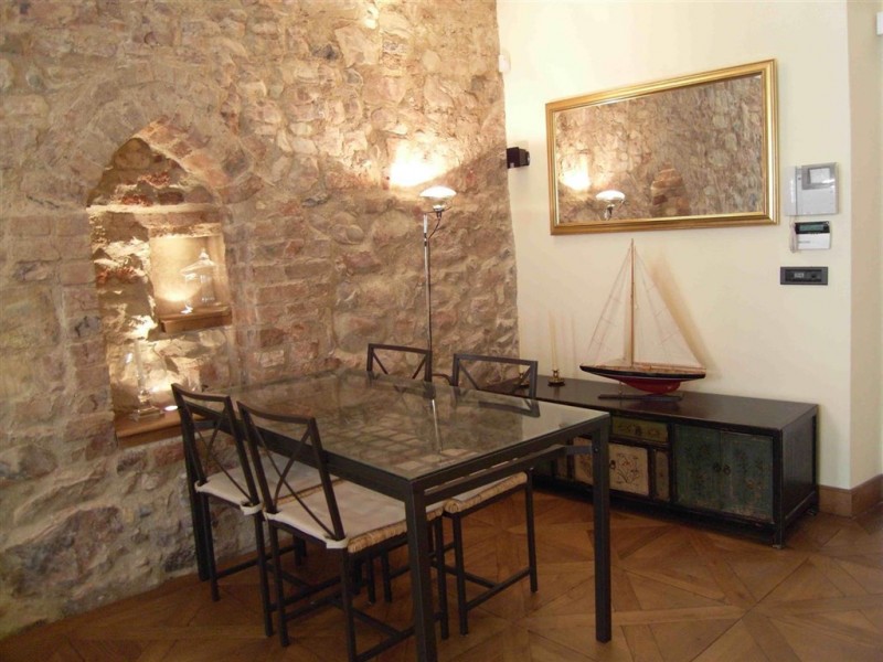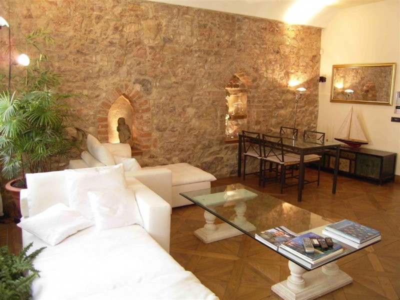 Historická kamenná zeď s osvětlenými výklenky, mozaikové parkety a přiznané trámy vytváří působivý interiér bytu.