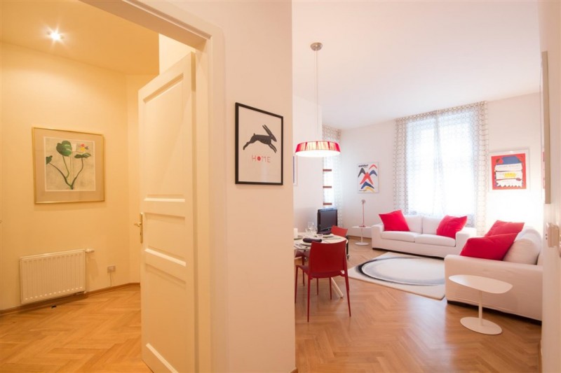 This striking fully furnished 1 bedroom apartment is situated on the 1st floor of a fully renovated apartment building directly opposite Rieger Park. The apartment comprises a fully equipped kitchen, living room, balcony, double bedroom and bathroom.