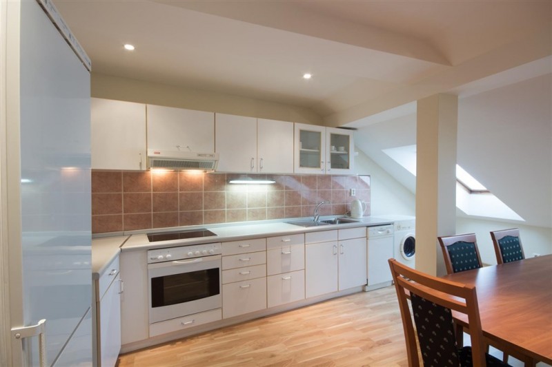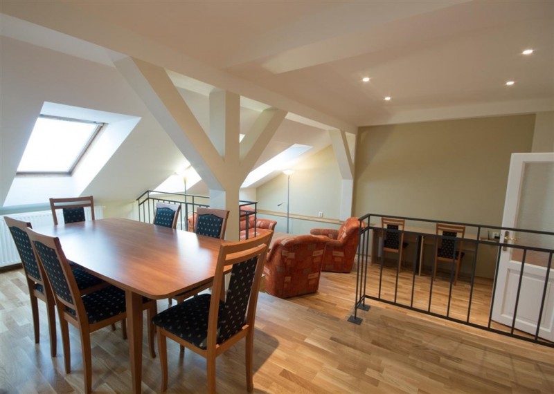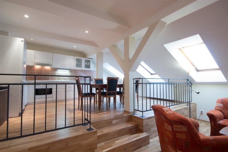 Situated on the top floor of a classic Vinohrady apartment building, this fully furnished apartment features three bedrooms and a small roof terrace.