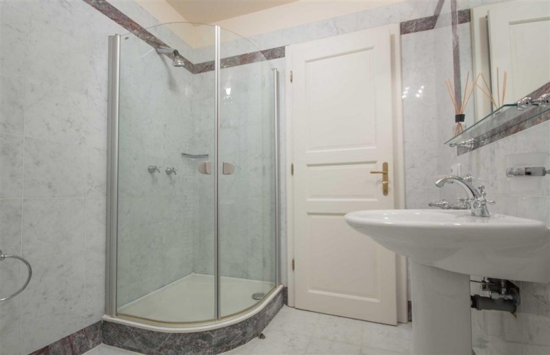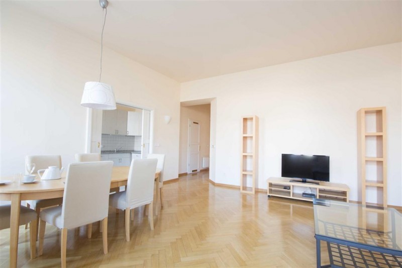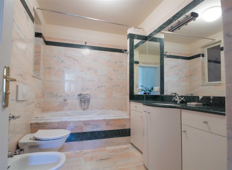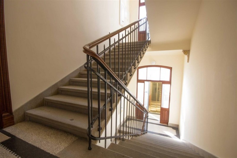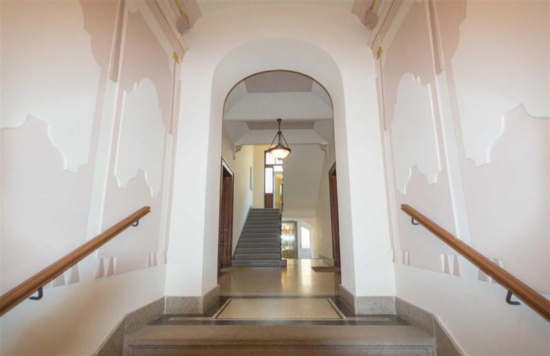 This light and airy apartment is situated on the third floor of a beautifully renovated representative building from 1904. The property comprises a spacious living room with balcony and view of the park, fully equipped kitchen with Whirlpool appliances and two double bedrooms are orientated to the quiet courtyard. The master bedroom benefits from a small balcony and an en-suite bathroom with marble floor, bathtub, WC, bidet and washbasin. In addition there is a second bathroom with shower corner, WC, bidet and wash basin. There is also a utility room with washing machine and tumble dryer.