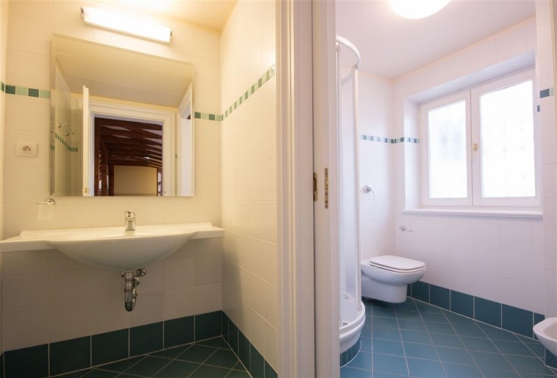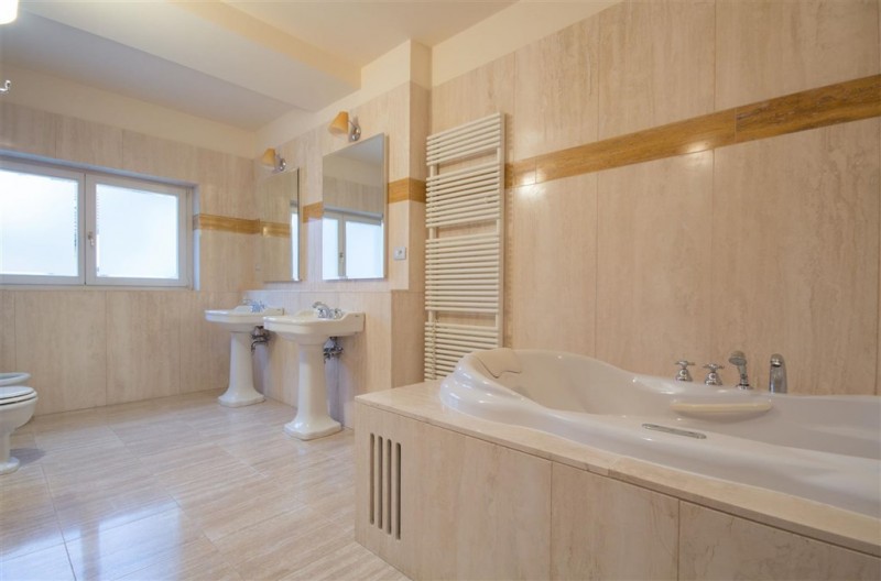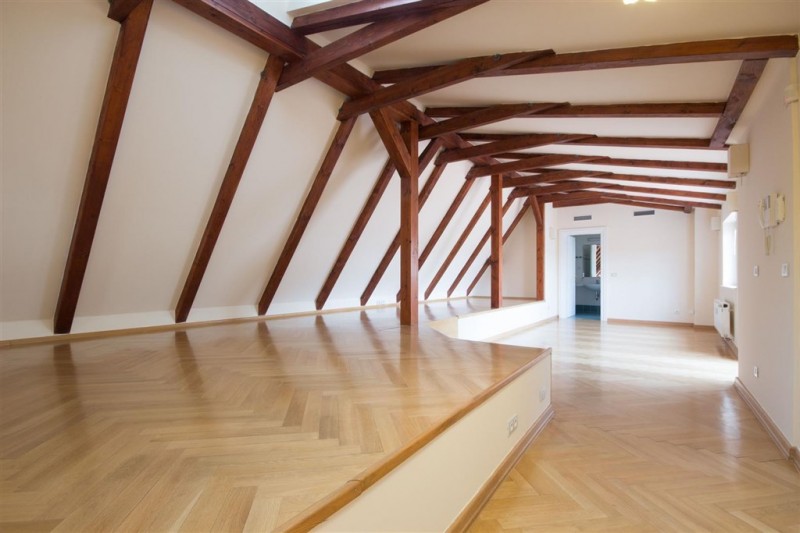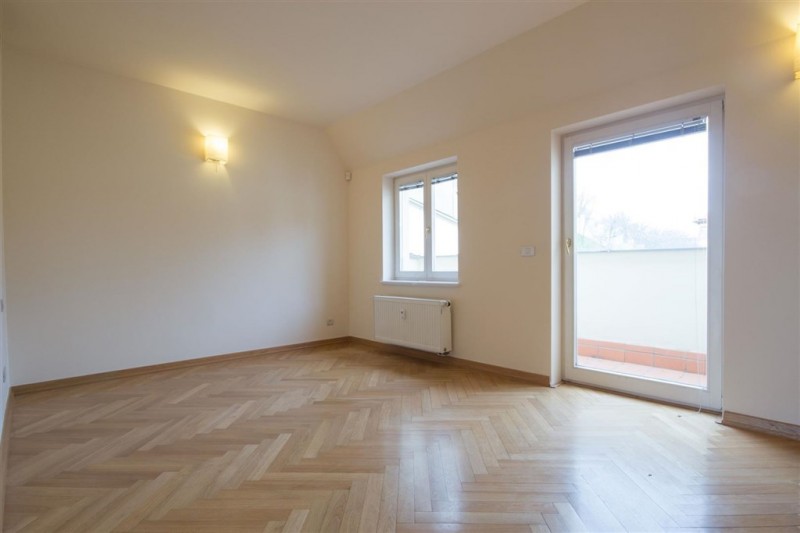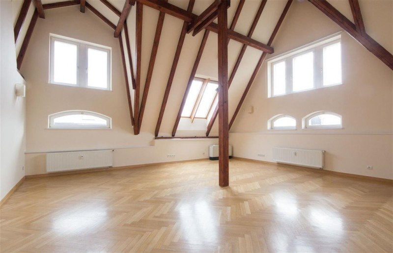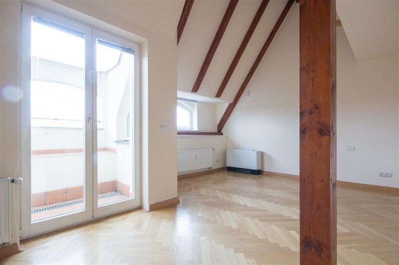 The upper level has a very large gallery with glazed wall with view over the living space, technical room, additional bathroom and access to the generous roof terrace (34m2) with views of Petřín and Prague castle. The exposed beams in the living space and gallery give the property a unique ambience.