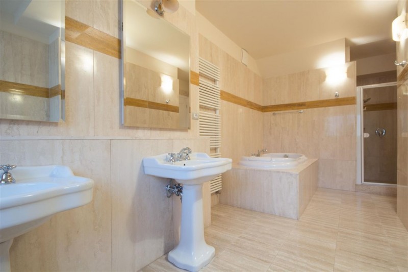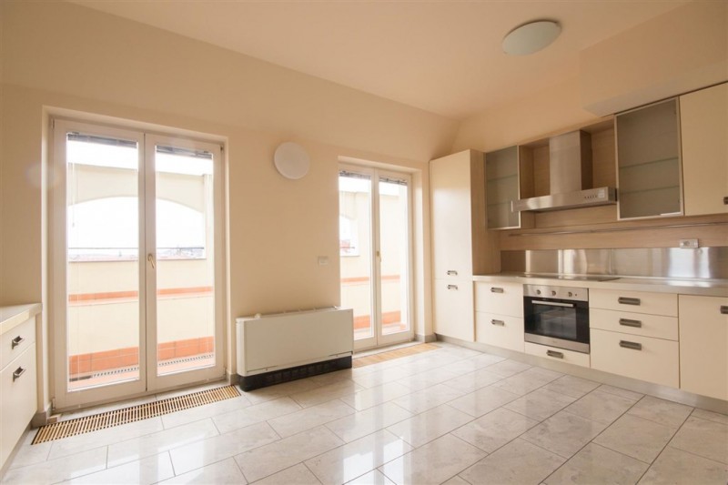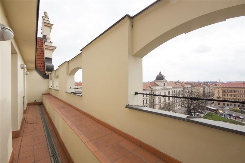 The lower level comprises a large fully equipped kitchen with serving hatch to the living room, master bedroom with en-suite bathroom, two additional bedrooms and a large family bathroom with bathtub and shower. The loggia, which is accessible from the kitchen and one of the bedrooms, has a lovely view over náměstí Kinských square.