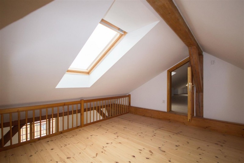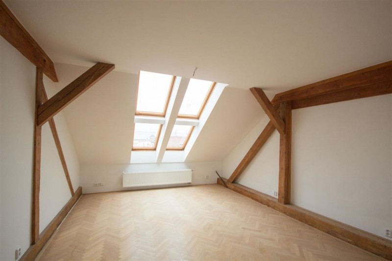 A spacious attic apartment arranged over two floors of a renovated Vinohrady building. This light two-bedroom apartment features exposed beams and benefits from a balcony with far reaching views.