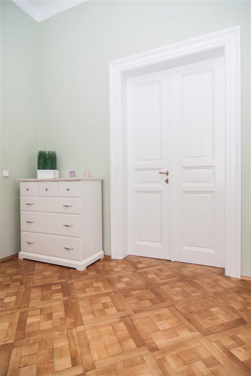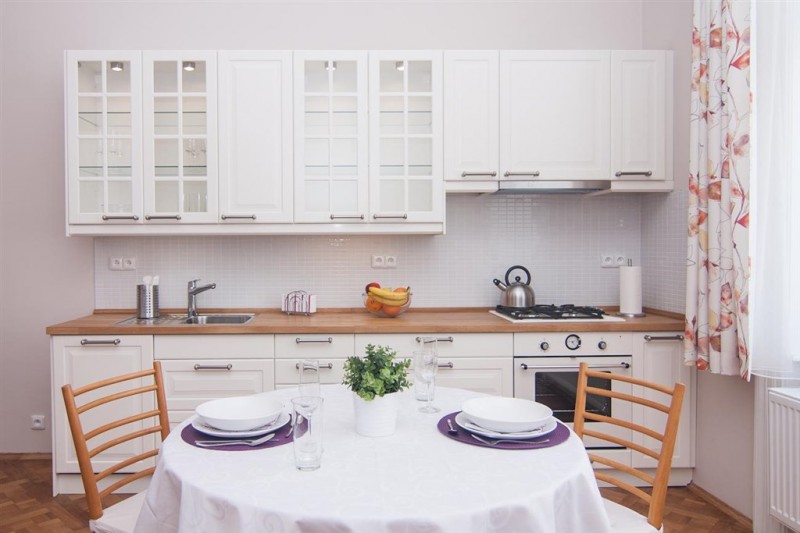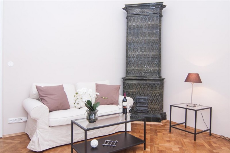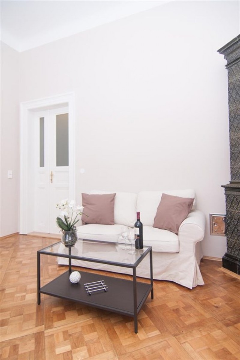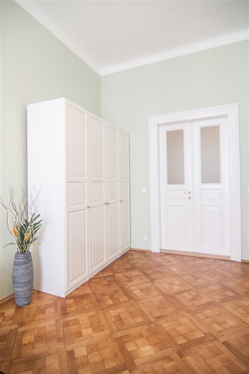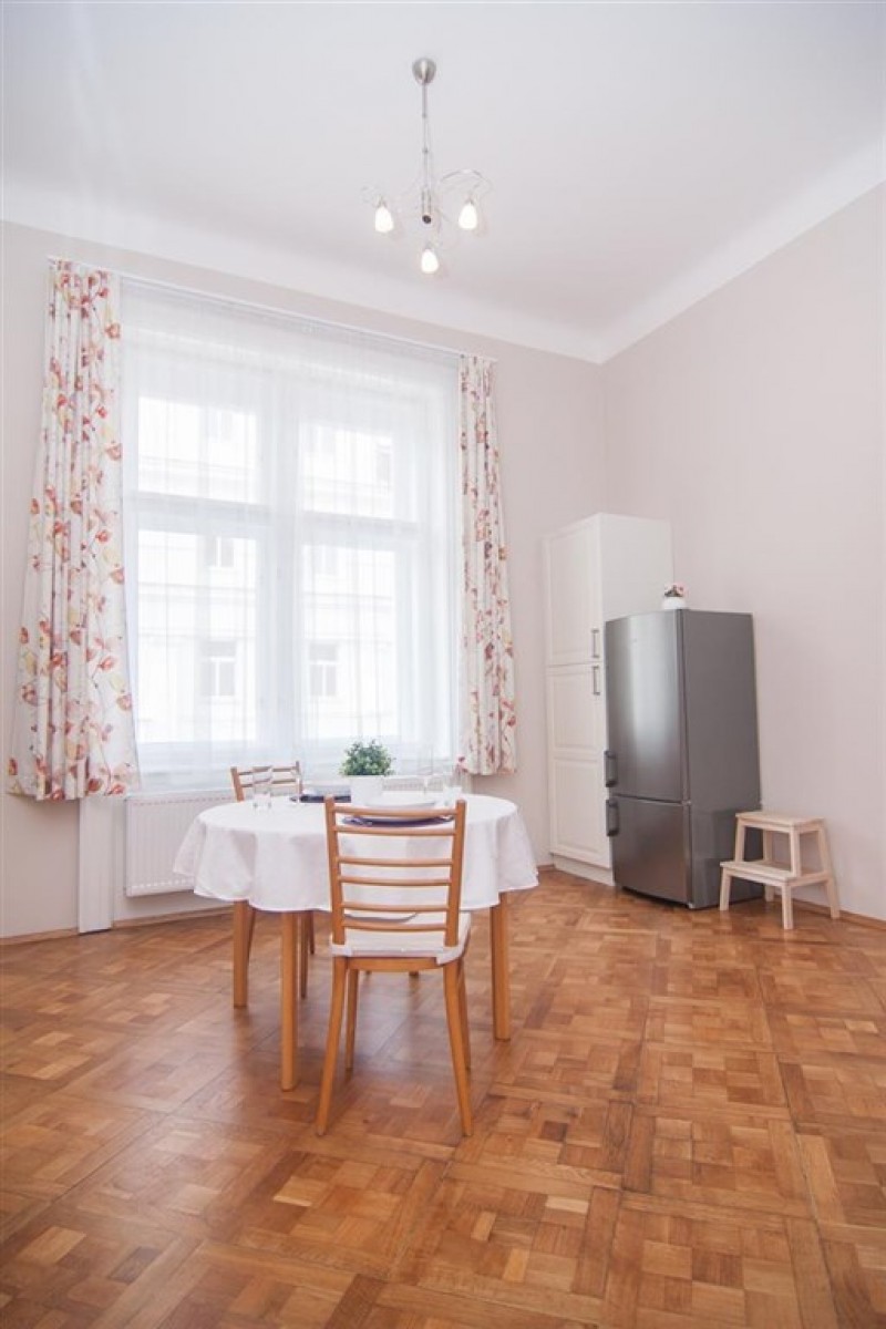 A fully furnished renovated one-bedroom apartment in a well maintained residential building in a quiet part of Vinohrady with a beautiful shared garden.