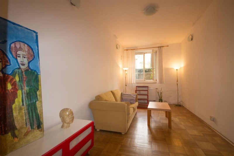 This characterful basement space, currently used as a flat, features exposed brickwork, vaulted ceilings, wooden floors and steps leading to a patio area and an attractive communal garden.